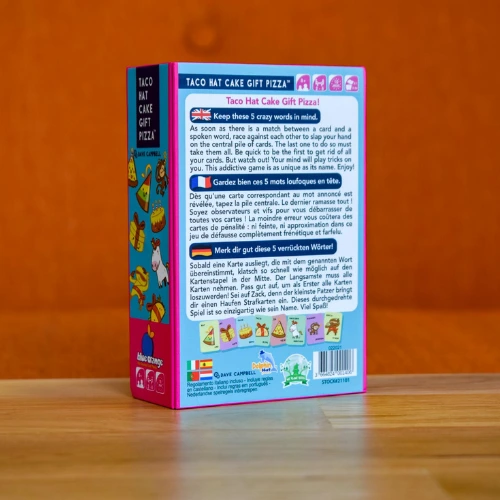 If the card flipped matches the word being said, players must race to slap the pile in the center. The slowest player picks up the entire pile and adds it to their stack. The objective is to be the first player to get rid of all their cards and shout “Pizza!” to claim victory!